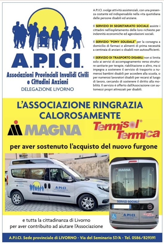 In Termisol Termica crediamo che il nostro impegno nei confronti della comunità vada oltre la fornitura di soluzioni innovative nel settore degli isolamenti termici e dell’efficienza energetica. Per questo motivo, siamo orgogliosi di aver contribuito concretamente all’acquisto di un nuovo furgone per l’ Associazione A.PI.CI., che si occupa del trasporto cittadino degli invalidi civili e degli anziani.